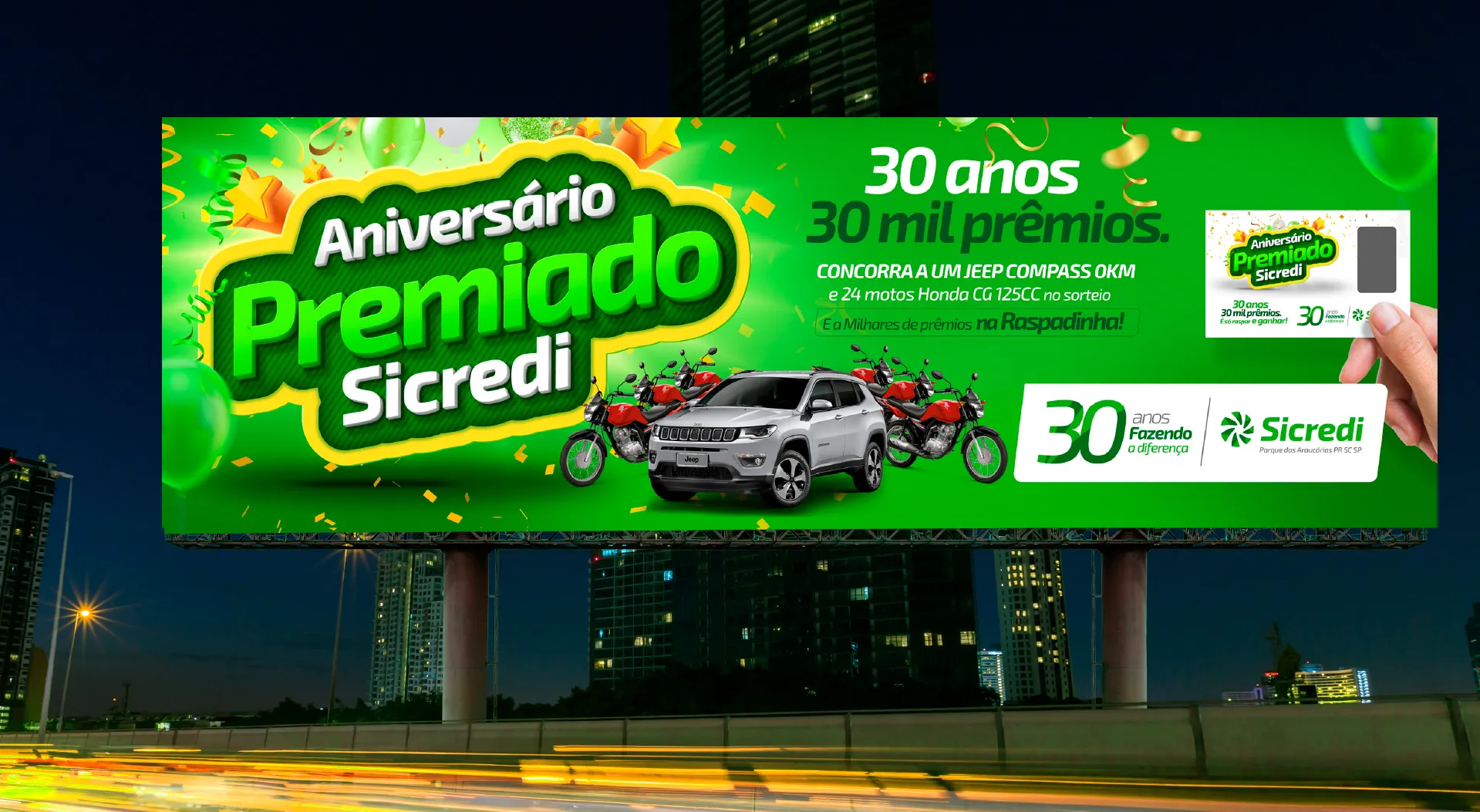Para celebrar os 30 anos do Sicredi Parque das Araucárias, a W.Godoy desenvolveu um selo comemorativo de 30 anos e a campanha Aniversário Premiado, unindo branding e direção criativa para fortalecer a presença institucional da cooperativa de crédito e gerar engajamento com associados. O projeto estruturou conceito de campanha, identidade visual da campanha, design gráfico e desdobramentos para comunicação digital e impressa, garantindo consistência de marca em materiais institucionais e promocionais ao longo do ano. Entregas conectadas: criação do selo, identidade da campanha, peças de divulgação e especificações técnicas de aplicação para uso em diferentes formatos e canais.